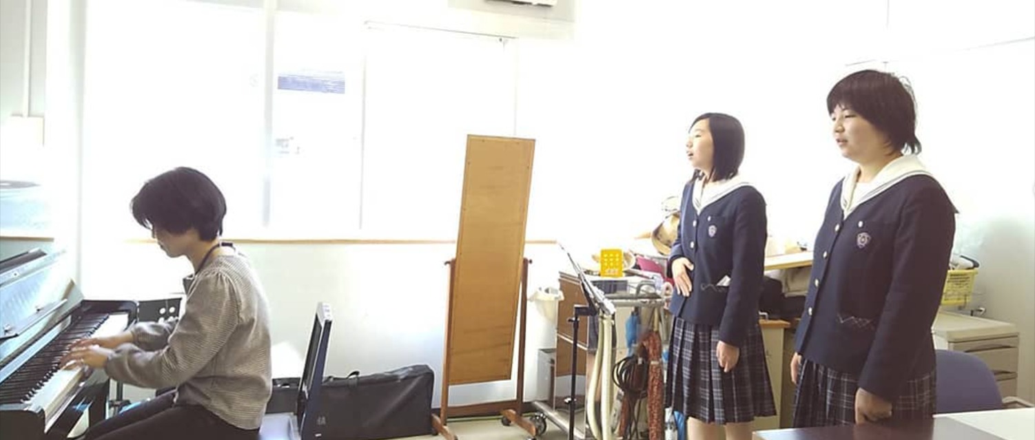 発声練習、各パートの音採りほか、ソルフェージュ(簡単なフレーズを見て、音程やリズムをとり歌ってみる)という練習もします。岡山県の合唱祭に合同発表で出演したり、合同練習に参加する機会もあります。楽譜が読めなくても、音程に自信がなくても、少しずつその生徒に合った練習をします。少ない人数なので、今は個々の予定に合わせた練習日程を組んでいます。美作高校として地域に出かけるイベントにも参加するチャンスがあります。